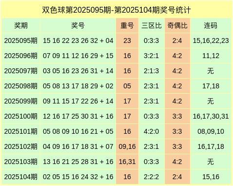 红球三区比为2:2:2,大小比为2:4,奇偶比为2:4,连码开出15,16,重复号码出现1枚16。